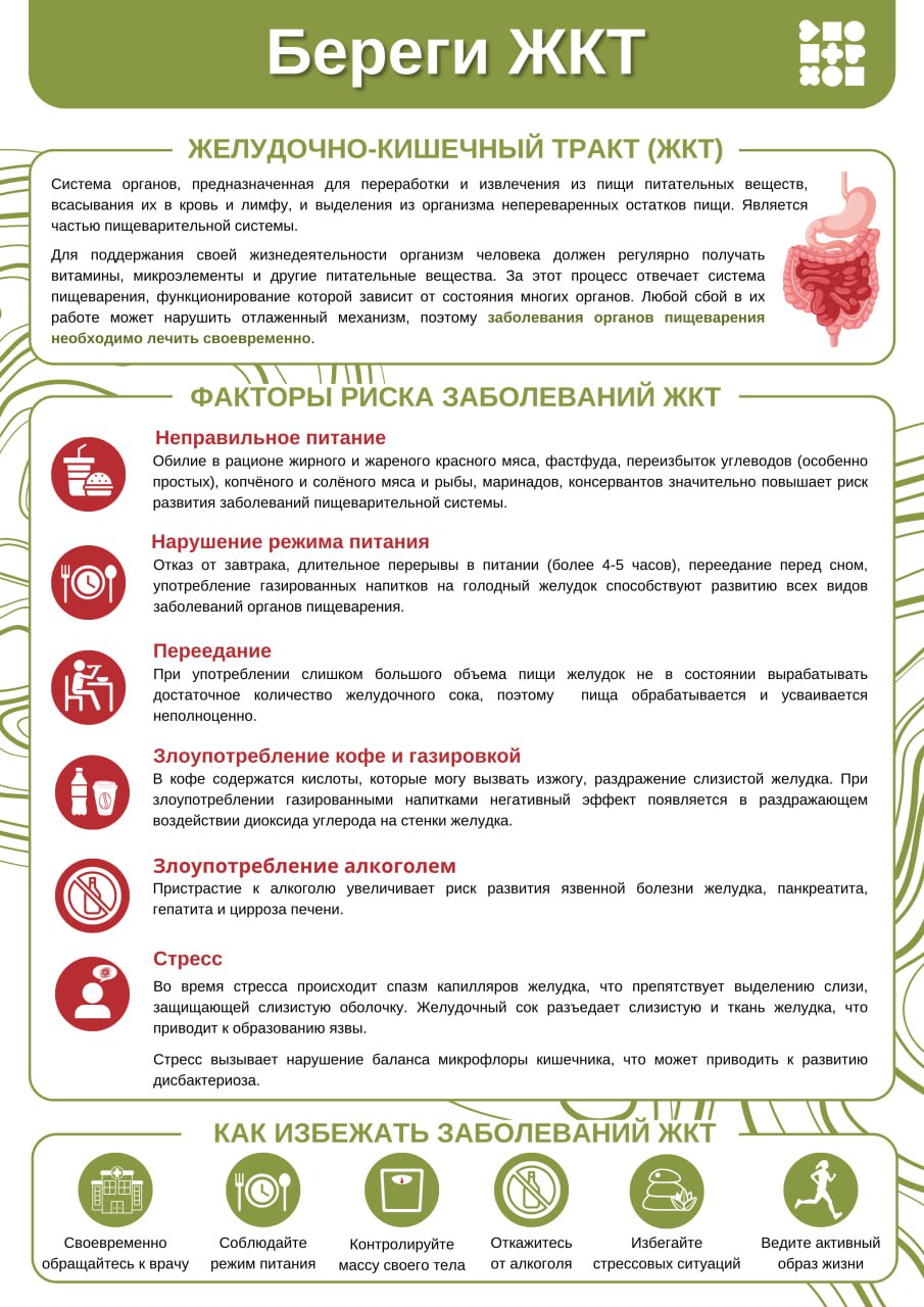 Согласно Плану проведения региональных тематических мероприятий по профилактике заболеваний и поддержке здорового образа жизни на 2025 год с 24 по 30 ноября 2025 года проходит Неделя профилактики заболеваний ЖКТ - Несмотря на наметившийся в последние десятилетия прогресс в вопросах профилактики, диагностики и лечения заболеваний органов пищеварительной системы, они остаются важной проблемой здравоохранения, и не теряют свою актуальность. Это связано с подверженностью современного человека воздействию большого числа как модифицируемых, так и не модифицируемых факторов риска.
